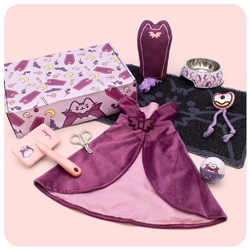 The Fall Cat Kit was love at first bite! The box was packed with fun ghoulish goodies. This cape in the Fall 2022 Cat Kit will have your fuzzy friend looking like a spooky cutie! Make cleaning up after your fuzzy friend a little less ghoulish when you use this Vampurr litter mat! Designed to trap small pieces of litter that your cat will track out of the litter box on their paws, this mat will help keep the litter in the box and not all over your house! Your fuzzy friend can enjoy all of their favorite Halloween treats in this Vampurr bowl! Pamper your Vampurr with this easy to clean brush! Keep your fuzzy friend's claws trimmed and neat with this Pusheen nail clipper! Your fuzzy friend can trick or treat themselves to a delicious snack with this fun and interactive treat ball! This coffin kicker toy helps satisfy your cat's natural instinct to kick during paytime! You and your fuzzy friend doughnut want to miss out on this extra sweet plush toy!